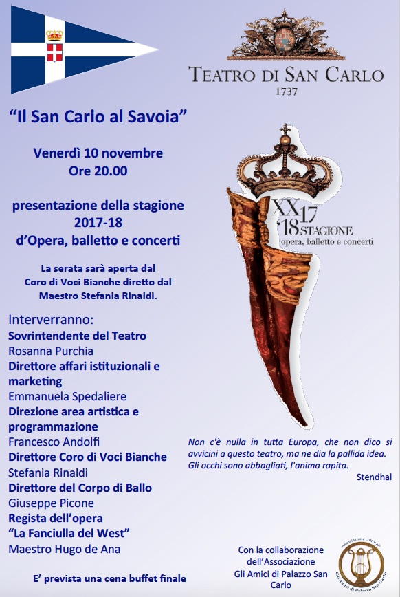[:it]“Il San Carlo al Savoia”: oggi, venerdì 10 novembre alle ore 20.00, è in programma presso il Circolo Savoia la presentazione della stagione 2017‐18 d’Opera, balletto e concerti del Teatro San Carlo. La serata sarà aperta dal Coro di trenta Voci Bianche diretto dal Maestro Stefania Rinaldi.